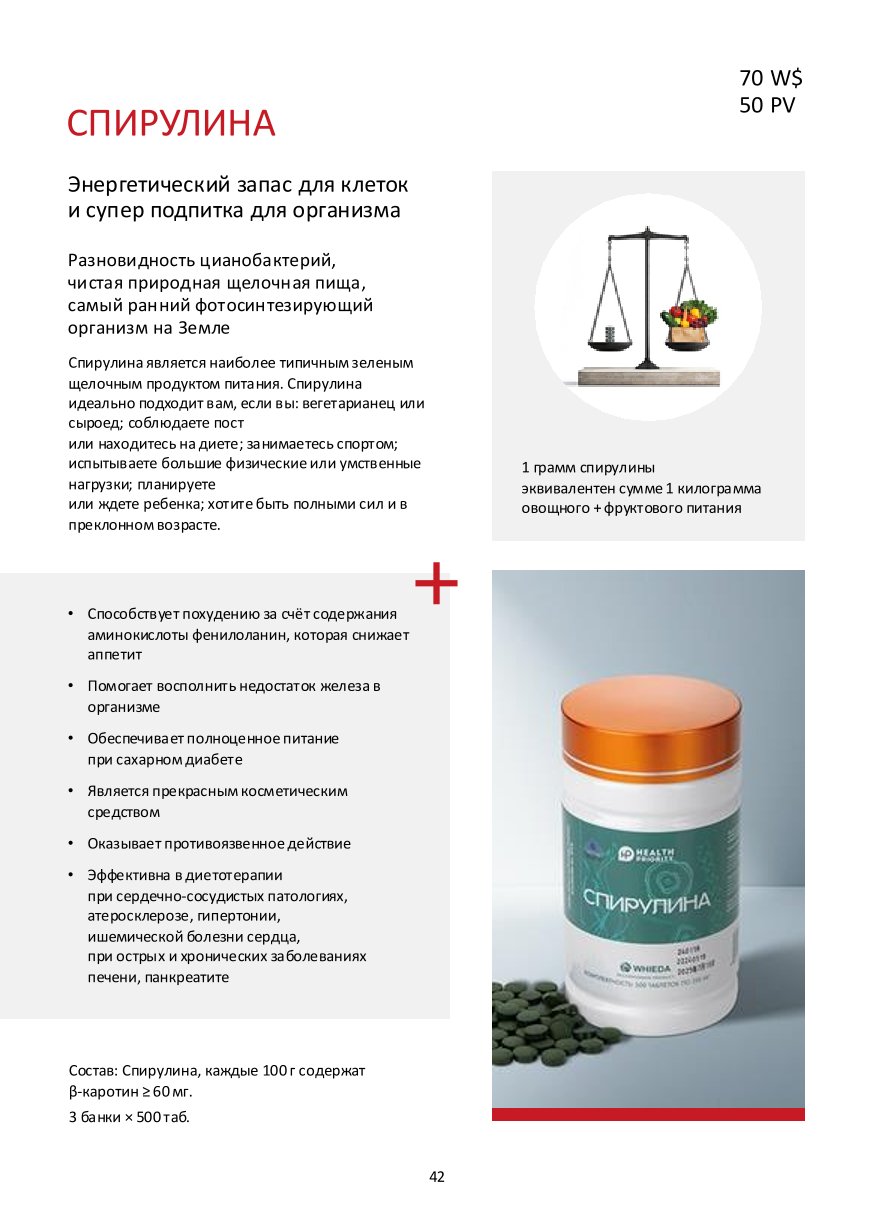 1 грамм спирулины эквивалентен сумме 1 килограмма овощного + фруктового питания. Спирулина является наиболее типичным зеленым щелочным продуктом питания. Она богата высоким содержанием белка, поливитаминов, нескольких минералов, Y-линоленовой кислоты, B-каротина, фолиевой кислоты, полисахаридов спирулины и других питательных веществ. Значимость спирулины также важна, как грудное молоко для малыша. Это натуральный, безопасный и сбалансированный продукт питания.